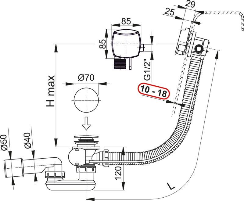 Badewanne Ab- und Überlaufgarnitur Automat Chrom mit Füllfunktion für dickwandige Badewannen. Siphonskonstruktion garantiert einen hohen DurchflussFlexi Überlaufschlach mit 4 Längenvarianten (60, 80, 100 a 120 cm)