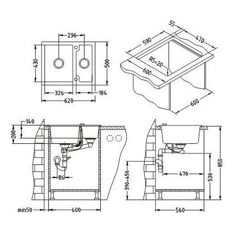 •für Unterschrank: von 600 mm