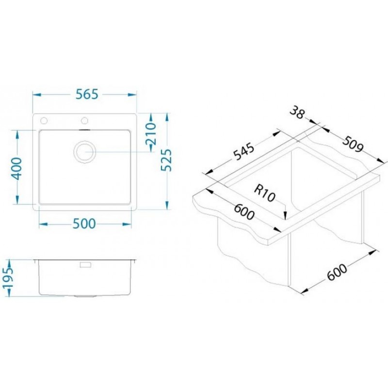 - Spülengröße: 565 x 525 mm