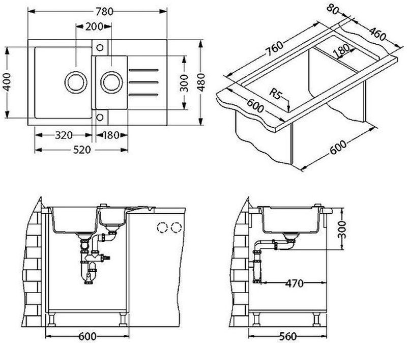 - Beckengröße: 320 x 400 x 180 mm / 180 x 300 x 120 mm