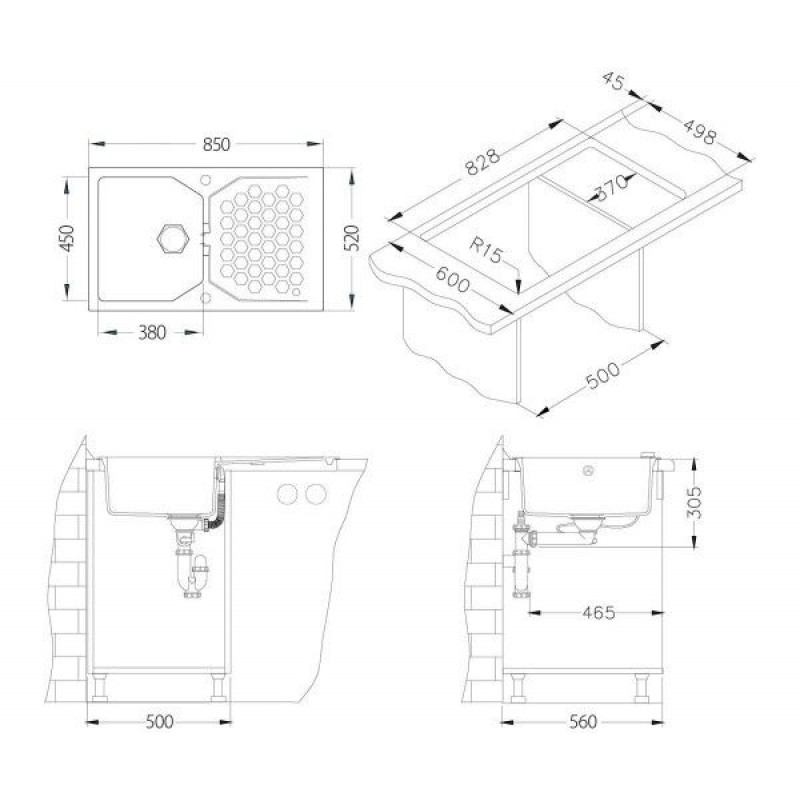 - Spülengröße: 850 x 520 mm