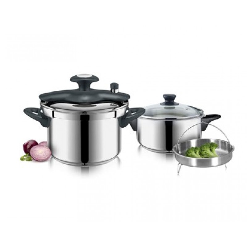BANQUET 7-teiliges Set, Schnellkochtöpfe INTEGRA 23DSS2240-60Schnellkochtopf INTEGRA mit Steuerungs- und Sicherheitsventil, Arbeitsdruck von 72 bis 88 kPa, sicheren Druck von 110 bis 155 kPa. Schnellkochtopf ist geeignet für alle Herdarten, einschließlich Induktion, hat eine dicke Sandwichboden.