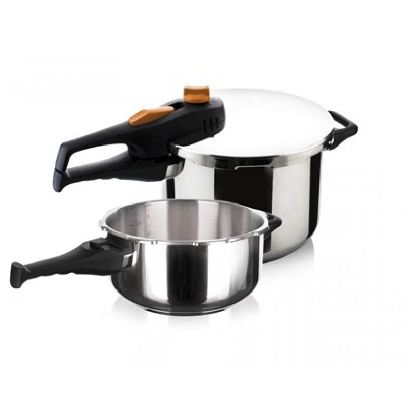 BANQUET Edelstahl Schnellkochtöpfe 3,5 + 6 L ADAGIO 23ASG22635LADEdelstahl Schnellkochtöpfe 3,5 + 6 L ADAGIO mit orangefarbenen Knopf, Bajonett Verschluss, in der Deckel - Sicherung gegen Öffnen und einer Silikondichtung, Arbeitsdruck von 0,6 oder 0,9 bar. Die Töpfe sind für alle Herdarten verwendbar und haben starke Sandwichboden.