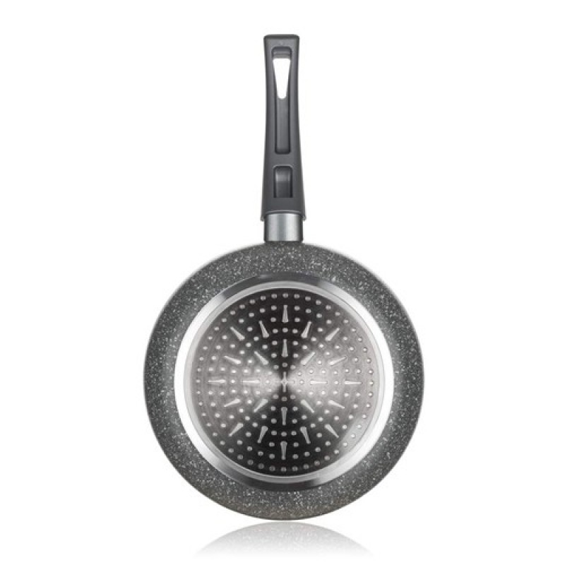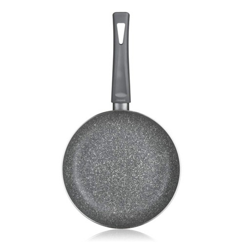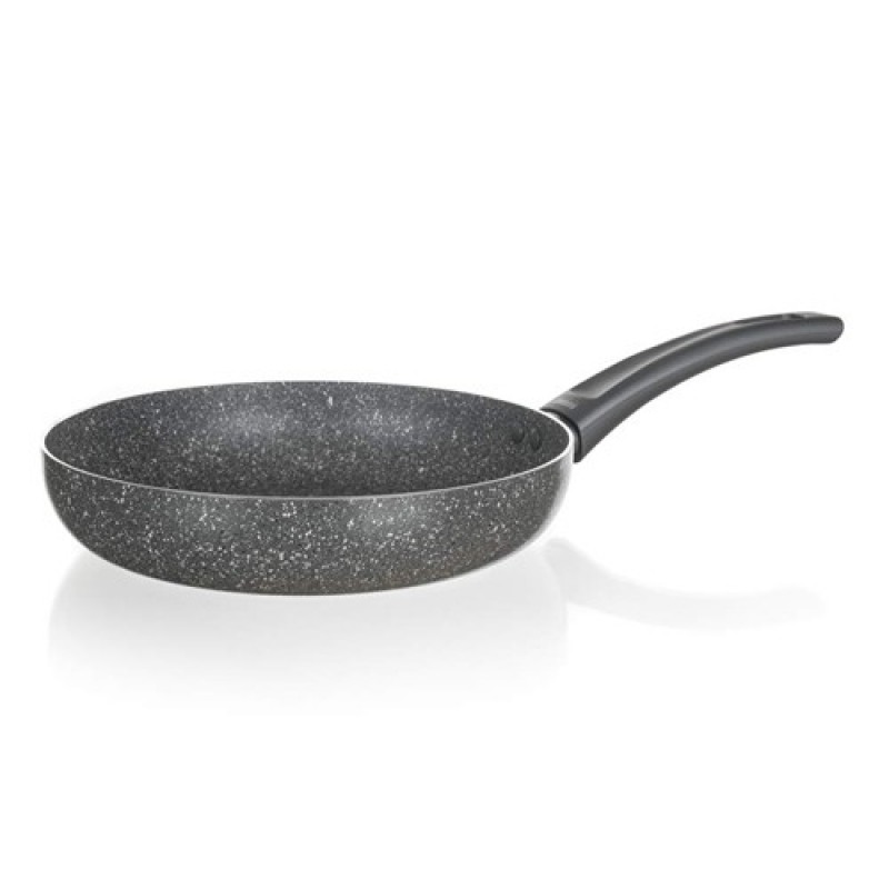 Aluminium-Pfanne mit Zweischichtoberfläche in Granitdekor, grau Bakelithandgriff mit Soft-touch Oberfläche und Voll Induktionsboden.Höhe (cm): 5
