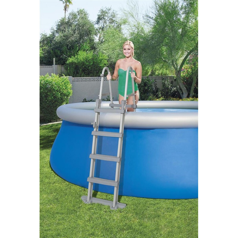 Das Fast Set™ Pool-Set von BESTWAY® mit einem Durchmesser von 457 cm und einer Höhe von 122 cm ist ein hervorragender Pool für die ganze Familie. Auf einer ebenen Oberfläche ist er innerhalb weniger Minuten aufgebaut, da nur der obere Ring aufzublasen ist; die Wände des Pools stellen sich beim Befüllen mit Wasser von selbst auf. Im Set enthalten sind eine 3.028 Liter Filterpumpe und eine Leiter. Der Pool kommt mit einem Ablassventil, das ein schnelles Entleeren am Ende der Badesaison ermöglicht. Der Fast Set™ Pool besteht aus robustem Tritech™, das für extrem lange Haltbarkeit sorgt und den Familienschwimmspaß auf Jahre garantiert!