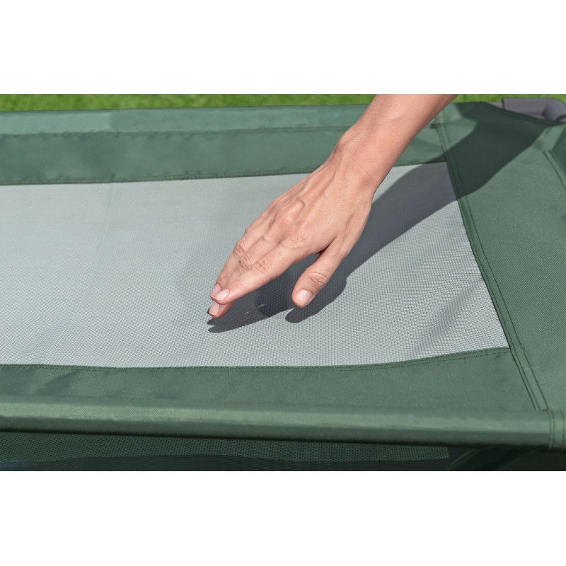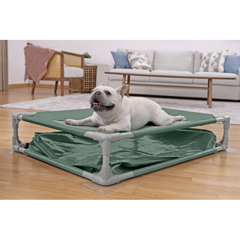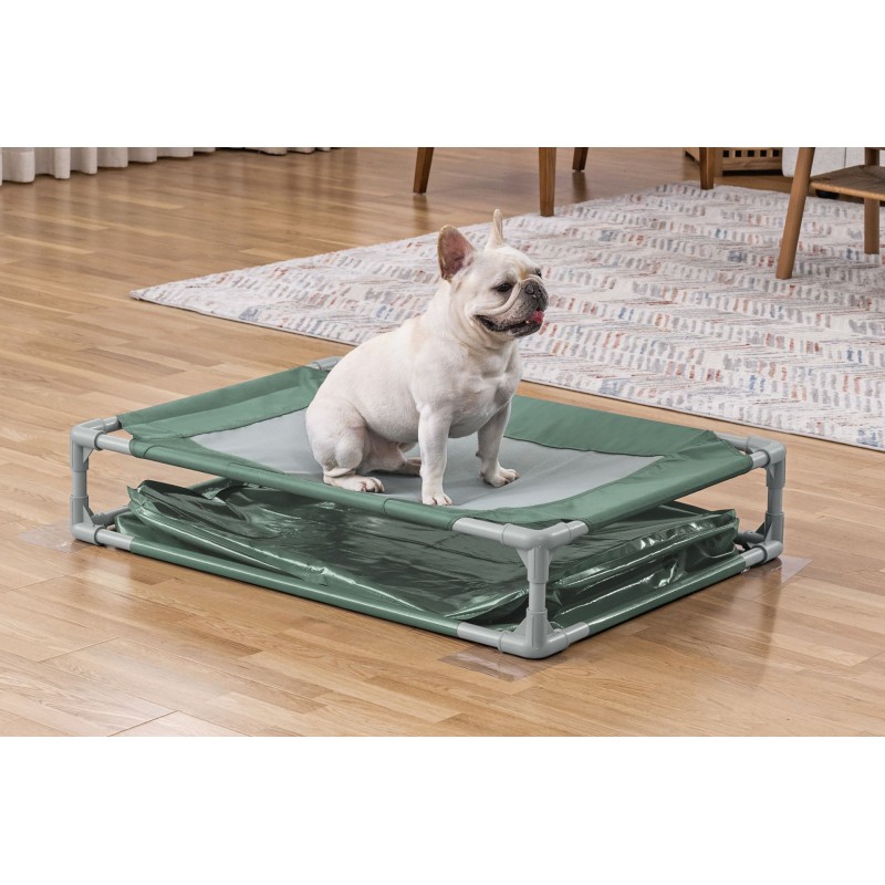 - Erhöhtes Bett – atmungsaktives Teslin-Gewebe kombiniert mit Oxford-Stoff für Komfort und Luftzirkulation.