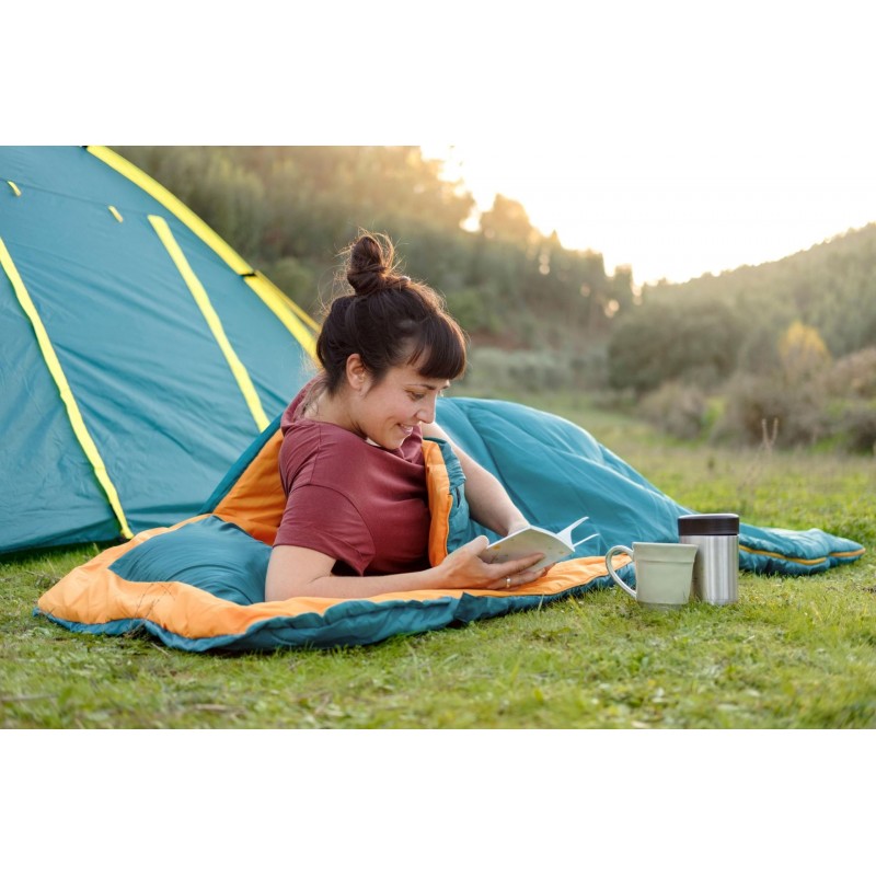 Im Pavillo™ Schlafsack Evade 5 werden Sie bequem und fest schlafen. Egal wo Sie schlafen, in einem Zelt, unter den Sternen oder in einem Haus mit allem Komfort, dieser Schlafsack ist angenehm isoliert, damit Sie die ganze Nacht lang gemütlich warm bleiben. Auch das aufblasbare Kissen trägt zu Ihrem Wohlbefinden bei. Das rechteckige Design ist kompakt, leicht und auf Ihren nächsten Trip mühelos mitzunehmen! Wenn der Schlafsack aufgerollt ist, halten Sie ihn mit den integrierten Elastikriemen zusammen, sodass Sie ihn leicht transportieren und aufbewahren können.