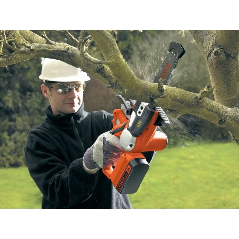 Kraftvolle und leichte 18 V Li-Ion Akku-Kettensäge GKC1820L20 von Black+Decker, mit der sich problemlos Äste bis zu 16 cm Durchmesser sägen lassen. Die sehr gute Ergonomie und das bedienerfreundliche Design machen das Arbeiten besonders bequem. Für die Sicherheit sorgen ein Handschutzbügel, ein Sicherheitsschalter gegen versehentliches Einschalten sowie eine Schutzvorrichtung an der Schwertspitze gegen Hochschlagen der Maschine.