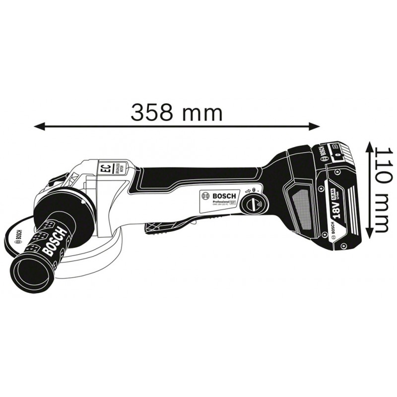 Akku-Winkelschleifer GWS 18V-10 PC. Verbesserte Leistungsfähigkeit und Werkzeugführung in der 18-Volt-Kategorie. Kleiner Winkelschleifer mit derselben Leistung wie ein kabelgebundener Schleifer mit 1000 Watt dank bürstenlosem Motor und ProCORE18V-Akku. Höherer Anwenderschutz und mehr Komfort dank KickBack Control und Intelligent Brake System. Der PROtection switch (Schutzschalter) schaltet den Schleifer unmittelbar nach dem Loslassen ab, wodurch der Anwenderschutz nochmals erhöht wird. Im Lieferumfang ist folgendes Zubehör enthalten: Aufnahmeflansch (ET-Nr. 2 605 703 014), Schnellladegerät GAL 1880 CV (1 600 A00 B8G), 1/1 L-BOXX-Einlage für Gerät und Ladegerät (1 600 A01 166), L-BOXX 136 (1 600 A00 1RR), Schutzhaube (1 605 510 365), Zusatzhandgriff Vibration Control (2 602 025 171), 2 x Akku GBA 18V 5.0Ah (1 600 A00 2U5), Schnellspannmutter (2 608 000 684).Technische Details: