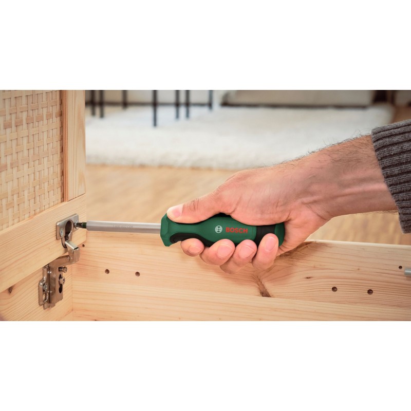 Erledigt alle möglichen Befestigungsarbeiten schnell und effizient mit dem hochwertigen Bit-Schraubendreher von Bosch. Er bietet eine komfortable und bequeme Möglichkeit, Reparaturen schnell und effizient durchzuführen und eine Vielzahl anderer Heimwerkerarbeiten zu erledigen. Dieser Bit-Schraubendreher verfügt über einen kompakten, ergonomischen Zweikomponenten-Griff mit Softgrip-Bereichen, der optimalen Komfort und Kontrolle gewährleistet. Die Bits bleiben dank eines starken magnetischen Bithalters im robusten Schaft fest an Ort und Stelle, was ein hohes Drehmoment von bis zu 21 Nm ermöglicht. Der sechseckige Griff verhindert ein Wegrollen.
