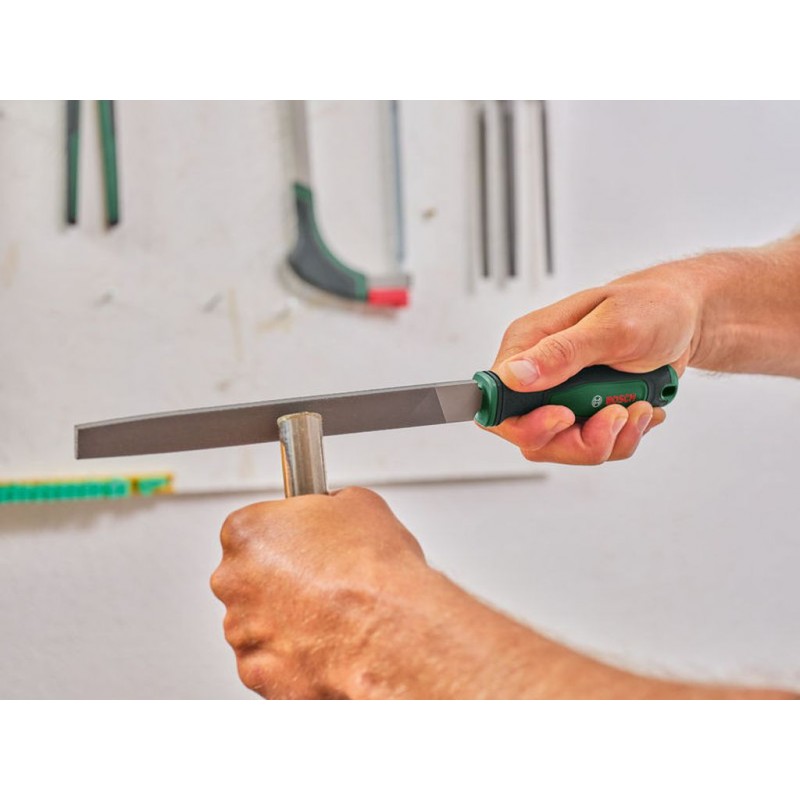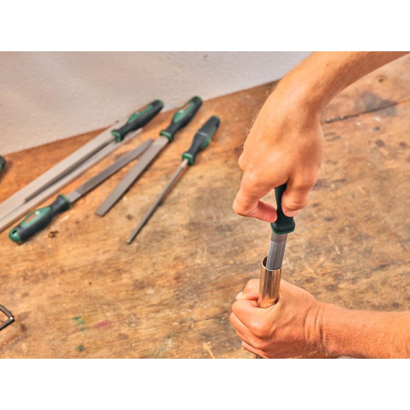 Insbesondere für Metallarbeiten sollte man immer ein 5-teiliges 200-mm-Feilen-Set von Bosch im Werkzeugschuppen haben. Dieses hochwertige Set umfasst 5 robuste Feilen – flach, halbrund, rund, Vierkant und Dreikant –, alle bestehend aus hartem Kohlenstoffstahl. Aufgaben wie das Entgraten werden effizient erledigt dank Halbschlicht-Feilen mit Hieb 2. Diese Feilen besitzen ergonomische Softgrip-Hefte mit Daumendruckbereichen für optimalen Komfort und beste Kontrolle. Für schnelle Aufbewahrung und Erreichbarkeit sind diese Feilen mit praktischen Aufhängeösen versehen.