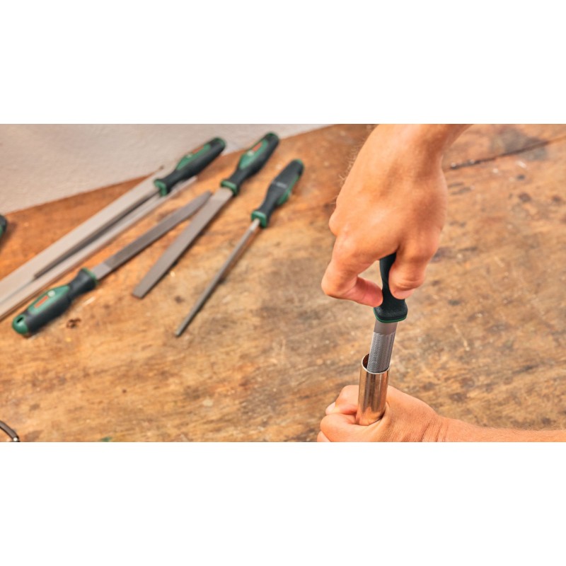 Wenn es um die Metallbearbeitung beim Heimwerken geht, ist das 4-teilige Bosch Metallfeilen-Set 200 mm / 8" mit Bürste die ideale Wahl. Dieses hochwertige Set besteht aus 3 robusten Feilen – flach, halbrund, rund – und einer Feilenbürste. Mit Hieb-2-Klingen eignet sich das Feilen-Set perfekt für die effiziente Metallbearbeitung. Die aus hochwertigem hartem Kohlenstoffstahl (63 ± 3 HRC) gefertigten Werkzeuge bieten Robustheit und Langlebigkeit. Die ergonomisch geformten Griffe mit weichem Softgrip und Daumendruckbereich tragen dazu bei, die Ermüdung der Hände zu reduzieren und die Kontrolle über das Werkzeug zu verbessern. Die Feilenbürste hilft dabei, die feilen sauber und effizient zu halten. Für schnelle Aufbewahrung und gute Erreichbarkeit sind die Werkzeuge mit einer praktischen Aufhängeöse versehen. Die Feilen entsprechen der Norm ISO 234.