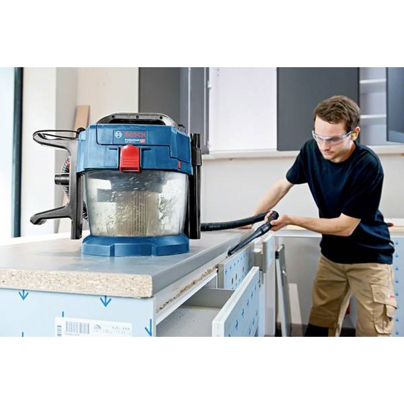 Der GAS 18V-10L Professional ist Boschs 18-Volt-Akku-Staubsauger der Staubklasse L mit voller Saugkraft. Seine Rotationsluftstromtechnologie verhindert Filterverstopfungen und sorgt damit für anhaltende, ununterbrochene Saugleistung. Das geringe Gewicht und die kompakte Bauform des Saugers ermöglicht einen einfachen Transport und eine problemlose Aufbewahrung. Dank seines Designs ohne Staubsack und seiner zahlreichen Zubehöre (inklusive) eignet er sich ideal für verschiedene Nass- und Trockenanwendungen. Das Gerät ist kompatibel mit dem Bosch Click & Clean System und allen Bosch Professional 18-Volt-Akkus und -Ladegeräten (Professional 18V System). Auch kompatibel mit AMPShare, der markenübergreifenden Akku-Allianz.