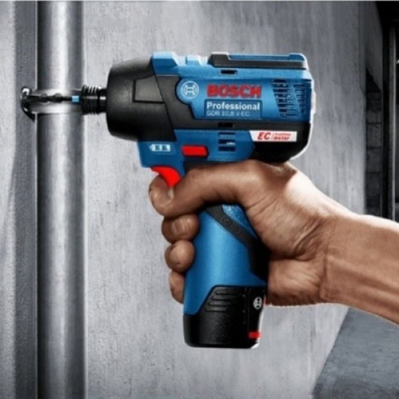 Akku-Drehschlagschrauber GDR 12 V-110. Mehr Lebensdauer und höhere Präzision und dabei so kompakt wie immer. 100 Prozent längere Lebensdauer durch die bürstenlose EC-Motorentechnologie und einem optimierten Schlagwerk. Höhere Genauigkeit beim Schrauben: 2-stufige PowerControl um Überdrehen von kleinen Schrauben zu vermeiden und ein max. Drehmoment von 110 Nm. Höhere Laufzeit durch die 2,5 Ah Akkupacks. LED-Ringlicht zur Beleuchtung des Arbeitsbereichs auch an dunklen Stellen. HEX9 Multi Construction Bohrer ? Bohren mit dem Akku-Schlagschrauber. Deutlich längere Laufleistung durch höchste Effizienz und die Bosch-Akkutechnologie. Sehr kompakte Bauform für perfekte Handhabung auch an engsten Stellen und Überkopf-Arbeiten. Bürstenlose EC-Motor-Technologie von Bosch für bis zu 100 Prozent längere Lebensdauer. L-BOXX 102 (1 600 A00 1RP), L-BOXX-Einlage Gerät, L-BOXX-Einlage Zubehör, Schnellladegerät AL 1130 CV (2 607 225 134), 2 x 2,5 Ah Li-Ion Akku (1 600 A00 4ZL)TECHNISCHE DETAILS
