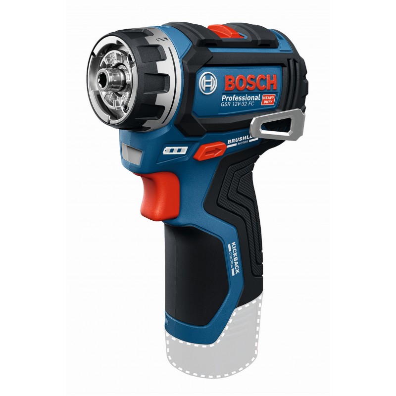 Der kabellose PRO GSR12V-32 FC bietet mit Advanced KickBack Control beste Werkzeugkontrolle. Diese Technologie minimiert die Verletzungsgefahr, wenn ein Bohrer abrupt klemmt oder selbst wenn sich das Werkzeug langsam um seine Bohrachse dreht und die Haltekraft langsam zunimmt. Dieser Bohrschrauber ist dank des Bosch Professional FlexiClick Systems mit leicht austauschbaren Aufsätzen zum Bohren und Schrauben vielseitig einsetzbar. Das Werkzeug eignet sich aufgrund seiner sehr kompakten Bauweise ideal zum Bohren und Eindrehen von Schrauben auf engstem Raum. Mit dem einzigartigen Bohrhammeraufsatz PRO GFA12-H kann das Gerät in einen Bohrhammer mit SDS plus verwandelt werden, der für das Hammerbohren bis O10 mm in Beton geeignet ist. Präzises Arbeiten in der Nähe von Kanten und Wänden gelingt mit dem Exzenteraufsatz PRO GFA12-E ganz einfach, während der Winkelaufsatz PRO GFA 12-W den Bohrschrauber zum Winkelbohrer macht. Diese Aufsätze können in einem 360°-Winkel in 16 verschiedenen Positionen arretiert werden, ohne dass sie vom Werkzeug enternt werden müssen. FlexiClick-Aufsätze können spezielle Werkzeuge für gelegentliche Anwendungen ersetzen, wodurch weniger Gewicht auf der Baustelle getragen werden muss. Das Bosch Professional FlexiClick System: Perfekt gerüstet für professionelle Arbeit.