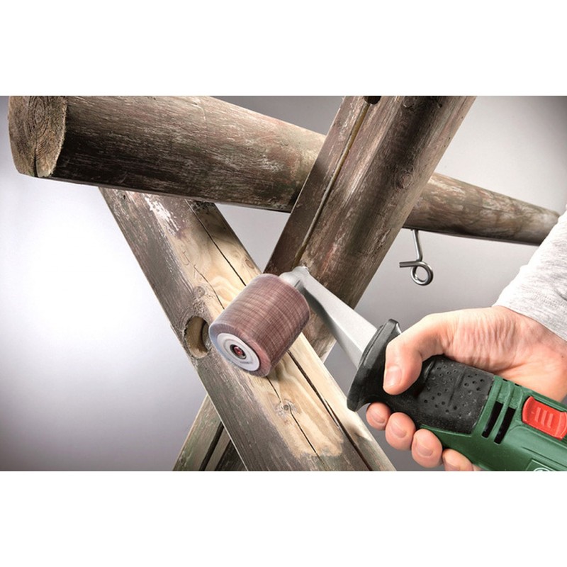- Mit den quer eingeschnittenen Lamellen der 60-mm-Lamellenrolle können Rundungen bei gewölbten Werkstücken mit Unregelmäßigkeiten mühelos geschliffen werden