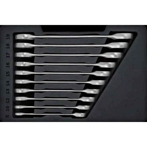 Das vielseitige, 10-tlg. Set enthält Maulschlüssel in den gängigsten Größen. Alle Maulschlüssel eignen sich für verschiedenste Anwendungen, da jeder Maulschlüssel einen Gabelschlüssel und einen Ringschlüssel in einem einzigen Werkzeug kombiniert. Alle Maulschlüssel sind ideal für Arbeiten an engen Stellen, da die zahnlose Ratsche einen Rückschwenkwinkel von nur 3 Grad erfordert. Die Fertigung aus hochwertigem Chrom-Vanadium-Stahl und der gehärtete bi-hexagonale Ring machen die Maulschlüssel robust und langlebig. Das 10-tlg. Set enthält Maulschlüssel in den folgenden gängigen Größen: 8, 10, 12, 13, 14, 15, 16, 17, 18 und 19 mm. Das Set wird in einer praktischen Halbeinlage geliefert, die mit dem Bosch L-BOXX Mobility System kompatibel ist.