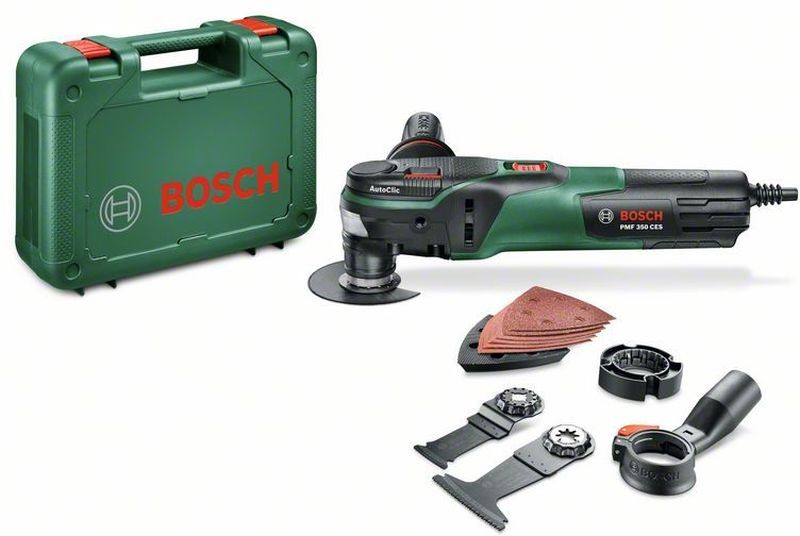 Das passende Multifunktionswerkzeug für anspruchsvolle Renovierungsarbeiten ist der Bosch PMF 350 CES. Dank der großen Auswahl an Starlock- und StarlockPlus-Zubehören ist das Gerät besonders vielseitig. Das AutoClic-System sorgt zudem dafür, dass sich das Zubehör innerhalb von nur drei Sekunden problemlos wechseln lässt. Mit einem 180°-LED-Lichtband ist der Arbeitsbereich immer hervorragend ausgeleuchtet. Der Motor mit 350 Watt Leistung garantiert einen schnellen Arbeitsfortschritt beim Schleifen, Trennen oder Sägen.Lieferumfang: