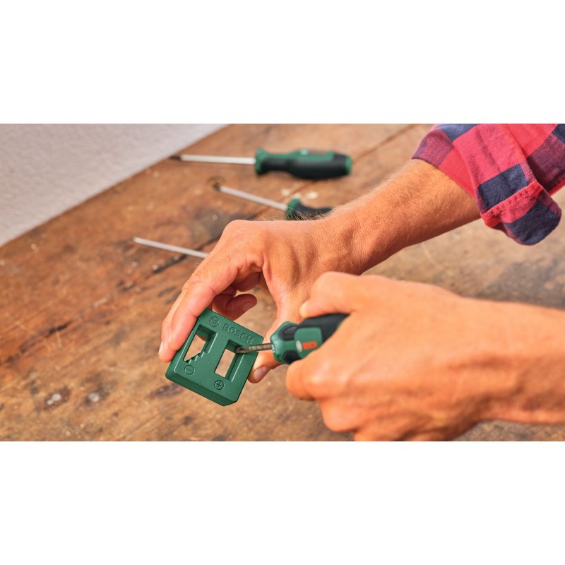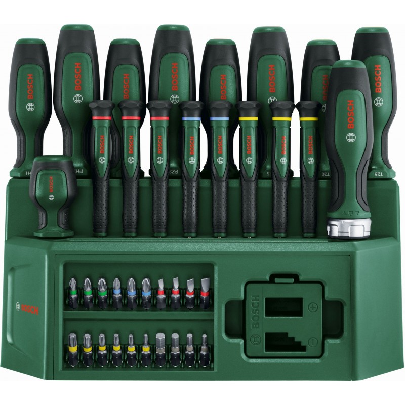 Erledige jede Befestigungsaufgabe schnell und effizient mit dem 39-teiligen, hochwertigen Bosch Schraubendreher-Set Mixed. Das Set enthält eine große gemischte Auswahl an Schraubendrehern: 8 normale Schraubendreher (PH1/2, PZ1/2, SL4/6,5, TX20/25), 8 Präzisionsschraubendreher (SL1,5/2,5/3, PH00/PH0, TX5/6/8), ein Bit-Ratschenschraubendreher, ein kurzer Bit-Schraubendreher und 20 Bits (PH1/2/3, PZ1/2/3, SL3/4/5/6, TX10/15/20/25/30,40, HEX3/4/5/6). Alle Schraubendreher sind aus langlebigen Materialien gefertigt. Sie haben weiche Zweikomponenten-Griffe für ultimativen Komfort. Dank farbcodierter Typenangaben können die Schraubendreher und Bits einfacher und schneller ausgesucht werden. Das Set enthält auch einen Magnetisierer zum einfachen Magnetisieren und Entmagnetisieren der Schraubendreherspitzen und -bits. Es wird in einem praktischen Gestell geliefert, das auf der Werkbank platziert werden kann und eine organisierte Aufbewahrung sowie einfachen Zugriff bietet.
