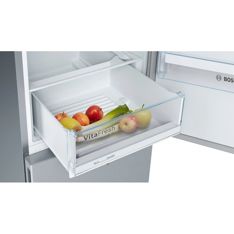 Die Kühl-Gefrierkombination Serie 4 mit VitaFresh-Technologie ist die ideale Lösung für eine längere Frische Ihrer Lebensmittel bei geringerem Energieverbrauch. Dank modernem Edelstahl-Design, den Standardmaßen 186 × 60 cm und der freistehenden Bauweise passt sie perfekt in jede Küche.