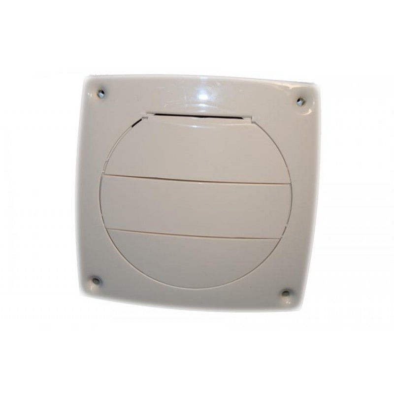Weiße Kunststoff-Verschlussklappe - bei Betrieb des Ventilators durch den Luftstrom öffnet und beim Ausschalten selbsttätig wieder schließt.Beim Einbau in Fenster oder dünne Platten wird die Verschlussklappe LHV von Außen auf den Fensterrahmen gesetzt.