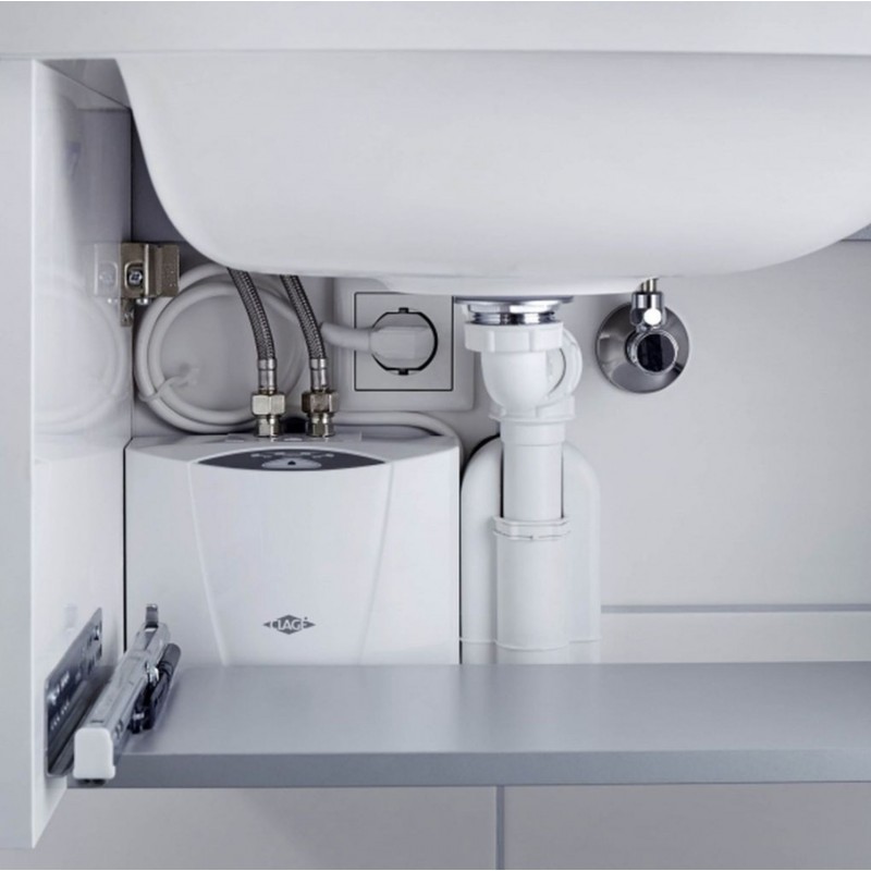 Die kompakten Abmessungen ermöglichen die Installation im Unterschrank unter dem Waschbecken, wo das Gerät kaum Platz einnimmt. Da das Wasser nur bei Verbrauch erwärmt wird, werden Energie und Platz gespart. Eine ideale Wahl bei Wohnungsrenovierungen, modernen Haushalten sowie überall dort, wo Hygiene, Effizienz und einfache Montage gefragt sind.