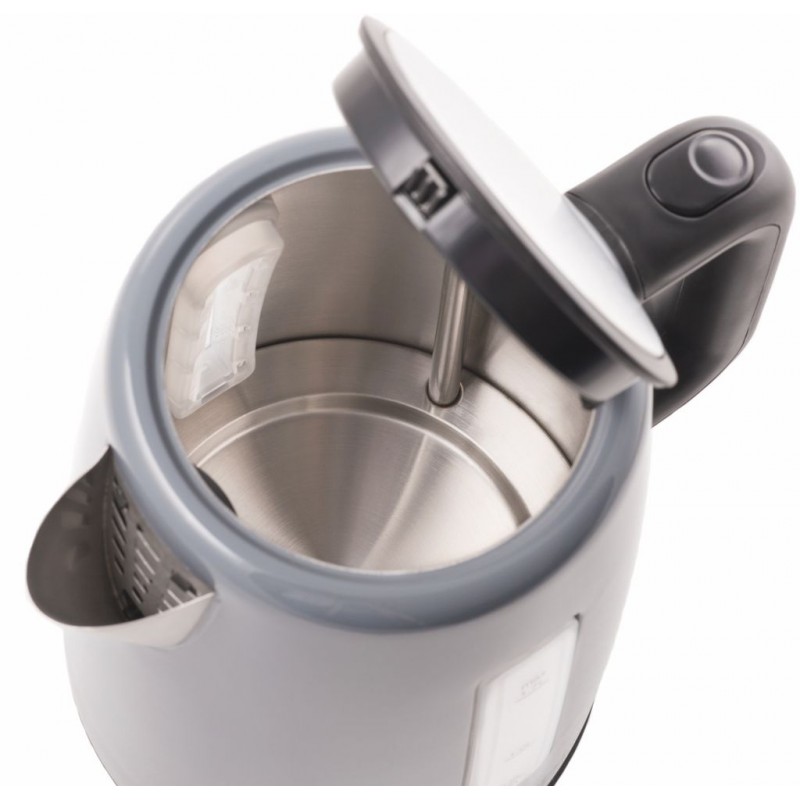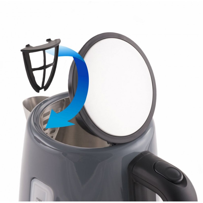 Moderner Wasserkocher aus grauem Edelstahl mit Füllmenge 1,7 Liter, mit herausnehmbarem Anti-Kalk-Filter