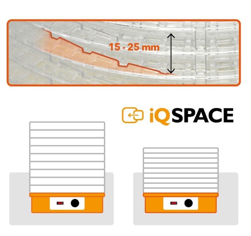 Passt sich Ihrer Küche an dank IQ Space System der höhenverstellbaren Etagen 15 - 25 mmPraktischer große Dörrgerät mit 9 transparenten Einlegeböden mit herausnehmbaren Mittelteil, Durchmesser 32cm, orange