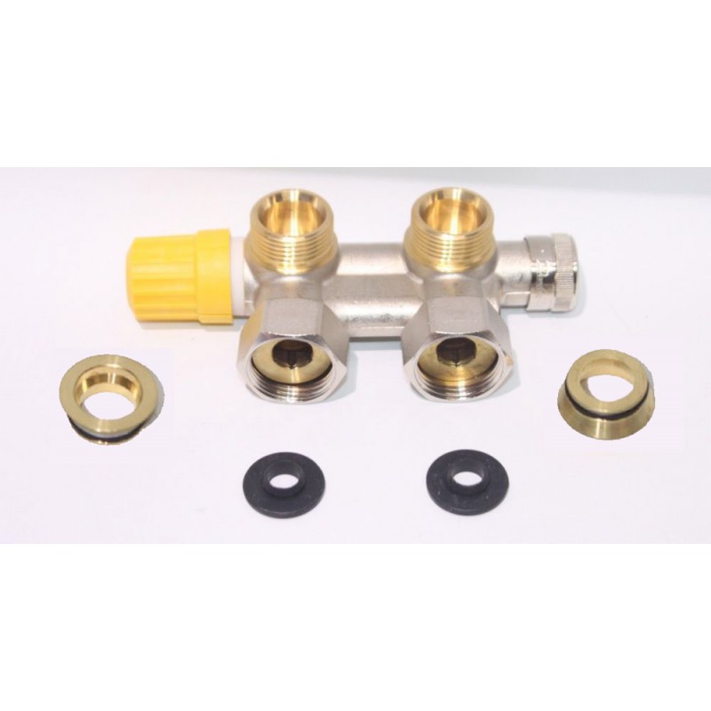 Anschlußarmatur Typ VHS-UN absperrbar mit Anschlußmöglichkeit für Entleerungs- und Füllarmatur, mit inte- griertem, voreinstellbarem Ventil, Mittenbstand 50 mm Ausführung: G 3/4 DG Kvs-Wert mit Stellantrieb: 0,02-0,55 Kv-Wert bei AP Bereich 1/2K mit RA-Fühler 0,31/0,48 Heizkörper: G 3/4 Anlage: G 3/4 Fabrikat: Danfoss Typ: VHS-UNUniversalanschlussarmatur vom Typ VHS für Zweirohrheizungsanlagen, absperrbar und entleerbar, Anschluss-/Mittenabstand: 50 mm.