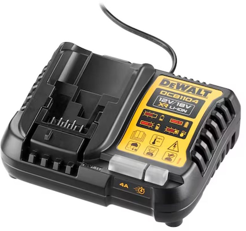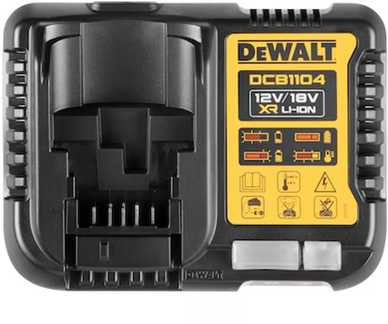 DeWALT DCB1104D2-QW ist ein kompaktes Starter-Set für XR 18 V Werkzeuge. Es enthält ein Ladegerät DCB1104 und zwei leichte XR 18 V 2,0 Ah Akkus für flexible Anwendungen.