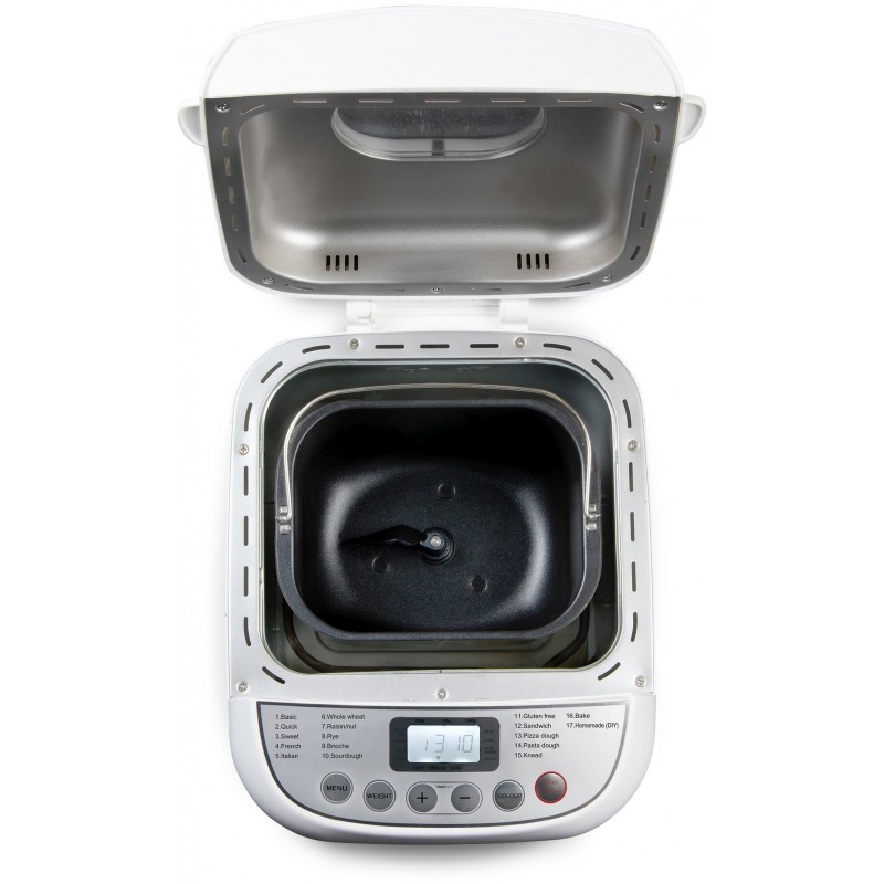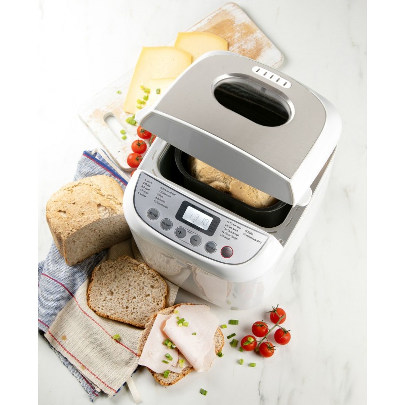 Vollautomatische Brotbackmaschine für den Heimgebrauch mit 17 automatischen Programmen. Die Maschine knetet den Teig, lässt ihn bei optimaler Temperatur aufgehen und fügt zur richtigen Zeit automatisch weitere Zutaten hinzu. Am Ende des Backvorgangs ertönt ein akustisches Signal, und wenn Sie das Gerät nicht ausschalten, hält es das Brot noch eine Stunde lang warm, damit Sie es auch später wie frisch gebacken entnehmen können.