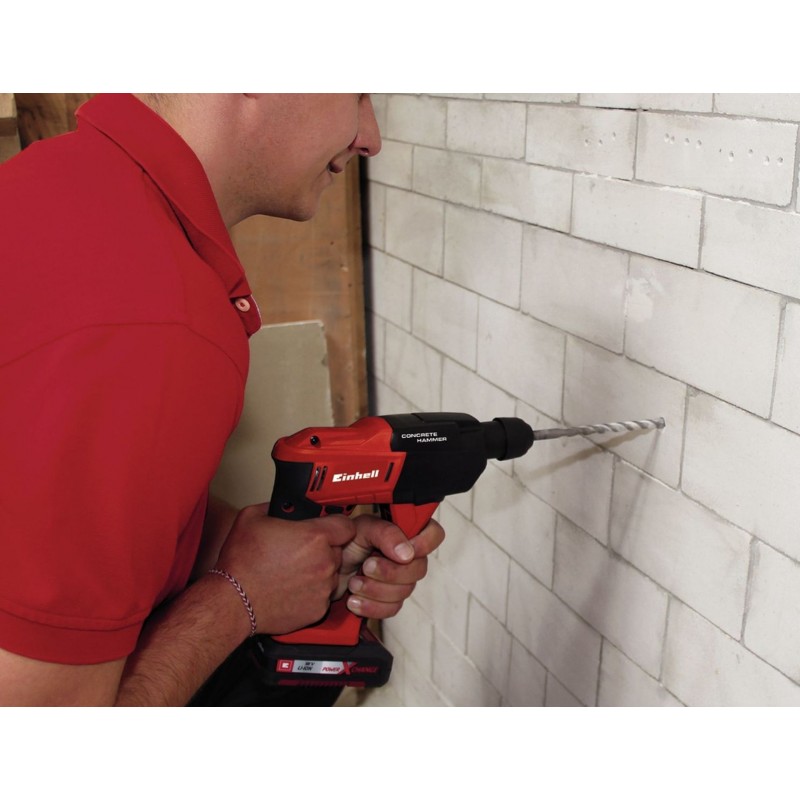 Der Akku-Bohrhammer TE-HD 18 Li-Solo ist ein robustes und vielseitiges Arbeitstier zum netzunabhängigen Schrauben und Bohren mit zusätzlicher kraftvollen Hammerfunktion. Durch das pneumatische Schlagwerk wird ein sehr guter Vortrieb in Mauerwerk und Beton ermöglicht. Dank der speziellen ergonomischen Griffform mit Softgrip, liegt der Bohrhammer jederzeit komfortabel und sicher in der Hand. Weiteren Bedienkomfort bieten die praktische Quickstop-Funktion gegen unerwünschtes Nachlaufen der Bohrwerkzeuge und das helle LED-Licht, das den Arbeitsbereich optimal ausleuchtet. An der Automatik SDS-Plus-Aufnahme können zudem Standard-Betonbohrer schnell und werkzeuglos gewechselt werden. Das 30 Minuten Schnellladegerät sorgt für ein schnelles Laden des kräftigen 18 Volt Systemakkus, der in vielen weiteren Geräten der Power X-Change Familie betrieben werden kann. Dank Lithium-Ionen Technologie können sich diese Akkus nicht mehr selbst entladen und die Geräte bleiben klein, leicht und handlich. Der Akku verfügt über eine integrierte Kapazitätsanzeige für die schnelle Sichtkontrolle des aktuellen Ladezustands. ACHTUNG: Dieses Gerät wird OHNE Akku und Ladegerät geliefert und dient somit als kostengünstige Erweiterung zu bereits bestehenden Geräten der Power X-Change Familie von Einhell.