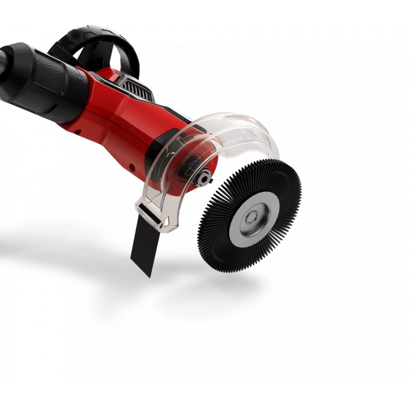 Der Akku-Fugenreiniger verfügt über eine transparente Spritzschutzhaube mit gut sichtbarer Führungslinie, die eine optimale Sicht auf die Fugen ermöglicht. Die Haube schützt während der Arbeit effektiv vor Staub und Schmutz und ist im Winkel verstellbar.
