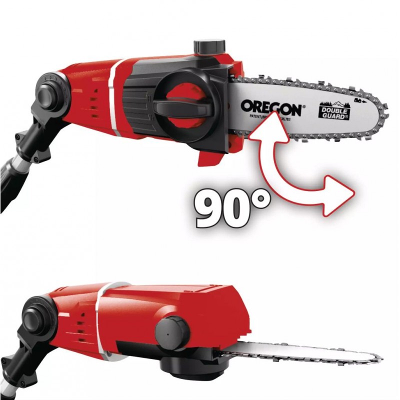 Der Original Einhell Hochentaster-Aufsatz ist ein Zubehör speziell passend für die Akku-Teleskop-Heckenschere GE-HH 18/45 Li T. In Kombination mit dem Hochentaster-Aufsatz wird die Heckenschere zum 2-in-1-Gerät, indem sie auch als Hochentaster zum Einsatz kommen kann. Der Akku-Hochentaster-Aufsatz arbeitet mit einer Schnittgeschwindigkeit von 3,76 m/s und ist mit OREGON-Qualitätsschwert und -kette mit einer Schwertlänge von 20 cm und 17 cm Schnittlänge ausgestattet. Mit dem 90° drehbaren Aufsatz gelingen mühelos auch Horizontalschnitte. Der Kettenwechsel erfolgt werkzeuglos, die Kettenspannung kann ebenfalls ohne weiteres Werkzeug eingestellt werden und die Kette wird automatisch geschmiert. Das robuste Metallgetriebe gewährt eine hohe Lebensdauer und der Krallenanschlag verhindert ein unkontrolliertes Ausschlagen der Säge. Zur sicheren Lagerung wird ein Köcher mitgeliefert.