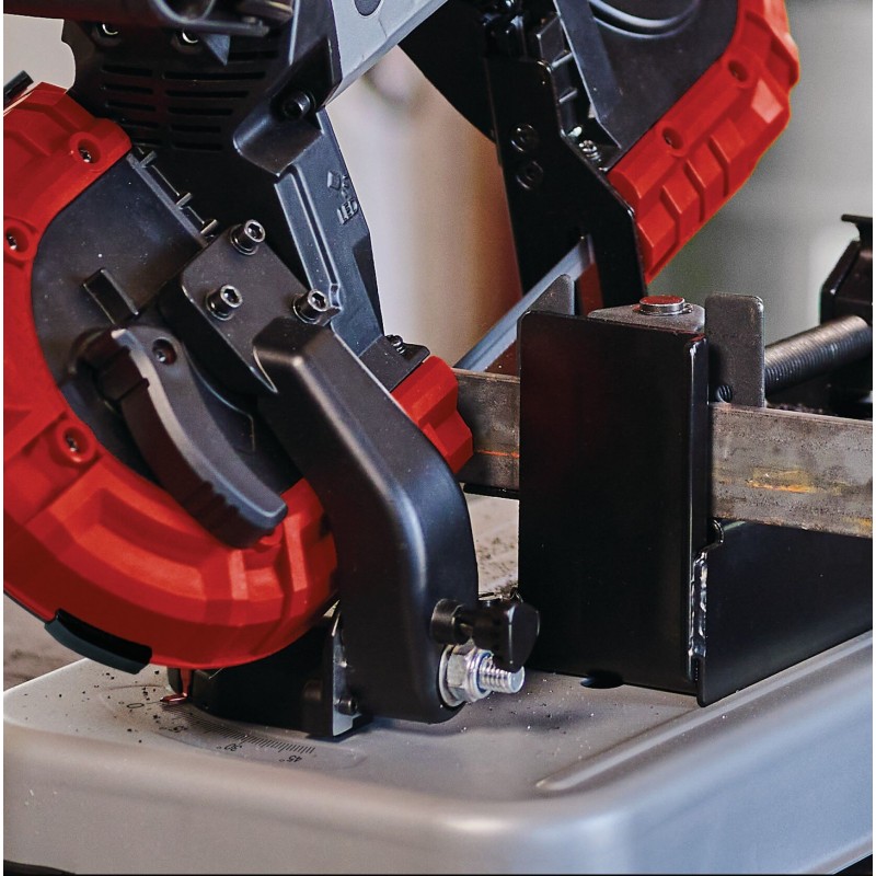 Die Einhell Akku-Bandsäge TE-MB 18/127 U Li-Solo ist ein leistungsstarkes Mitglied der Power X-Change-Familie – jeder System-Akku kann mit jedem PXC-Gerät kombiniert werden. Die kabellose Bandsäge bietet flexible Einsatzmöglichkeiten und ist sowohl mit als auch ohne Untergestell nutzbar. Höchste Sicherheit ist durch das funkenfreie Trennen von Metall im Einsatz gewährleistet. Der Winkel für Gehrungsschnitte ist von 0° Grad bis 47° einstellbar, die Schnitthöhe und -breite belaufen sich auf 115 x 127 mm. Der Schnellspannhebel sorgt für ein einfaches Wechseln des Sägebandes. Der Handgriff ist werkzeuglos verstellbar. Die optimale Drehzahl ermöglicht ein Arbeiten für fast alle Anwendungen. Das integrierte LED-Licht dient der idealen Beleuchtung des Schnittbereichs. Im Lieferumfang enthalten ist ein zweites Sägeband und ein Untergestell. Die Lieferung erfolgt ohne Akku und ohne Ladegerät, diese sind separat erhältlich, zum Beispiel als praktisches Starter-Set.