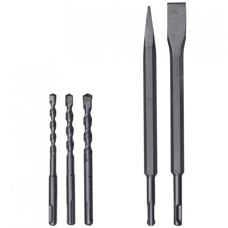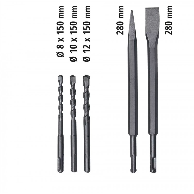 - Inkl. 3 Bohrern (O 8, 10, 12 mm) sowie Spitz- und Flachmeißel