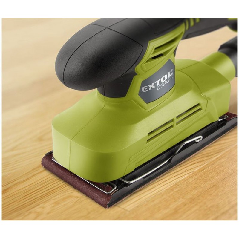 Die Schwingschleifer Extol Craft 407114 ist zum Trockenschleifen von Holz und Holzwerkstoffen, Metallen und zum Verschleifen von beschädigten Oberflächenbehandlungen, wie z. B. Farben und Lacken, ferner auch Kittmassen u. ä. bestimmt. Das Schleifen erfolgt durch mikrofeine Vibrationen einer rechtwinkligen Fundamentschleifplatte, die mit hoher Frequenz oszilliert, wodurch sich der Schwingschleifer sehr gut zum Schleifen an rechtwinkligen Stellen eignet, wie z. B. Fußbodenecken, und zum Endschleifen von feinen Oberflächenmängeln vor dem Auftragen der Oberflächenbehandlung. Der Schwingschleifer ist nicht zum Schleifen von Gipskarton und Bauwerkstoffen bestimmt.Der Schwingschleifer Extol Craft 407114 verfügt über eine Schleifbasis aus Kunststoff mit einer Schaumschicht, wodurch der Schleifer leichter ist. Der Schleifer verfügt über die Anschlussmöglichkeit einer externen Staubabsaugung. Das Schleifpapier ist an der Basisplatte mit Hilfe von Klemmen befestigt.