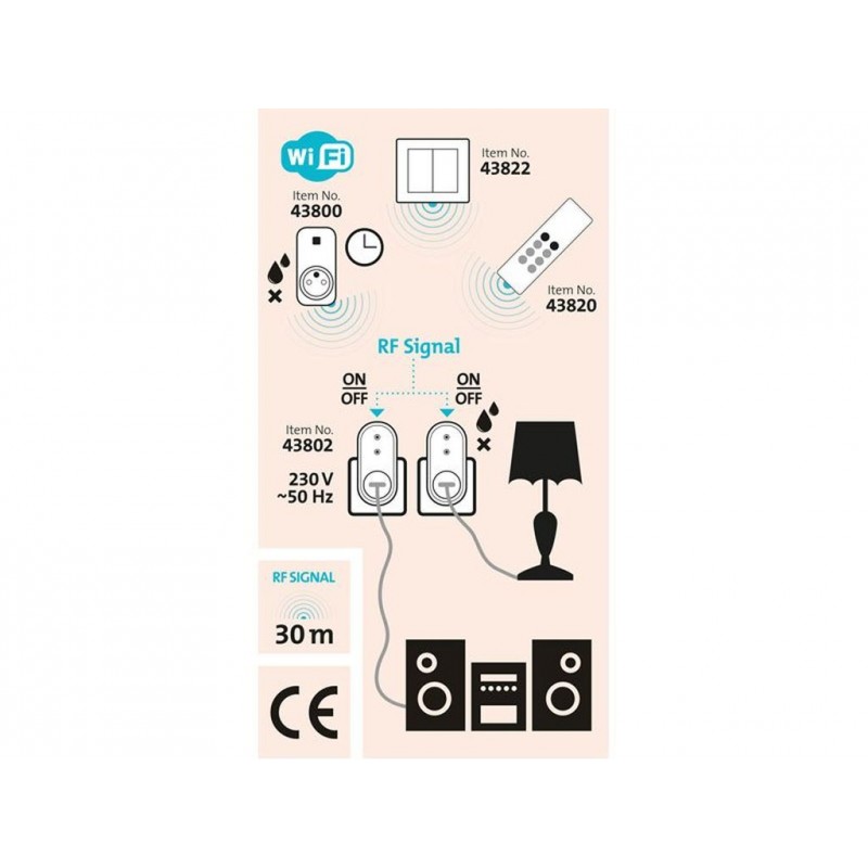 Set von 2 funkgesteuerten Steckdosen ohne Fernsteuerung. Über eine Fernsteuerung (Extol® Light Bestellnummer 438020, 43822) oder Wlan-Steckdose (Extol® Light 43800) können unabhängig 1 bis 3 Steckdosen oder alle zugleich ein-/ausgeschaltet werden. Mit der Fernbedienung kann die Betriebszeit der Steckdosen von angeschlossenen Geräten nicht programmiert werden. In der Lieferung ist keine Fernsteuerung enthalten.