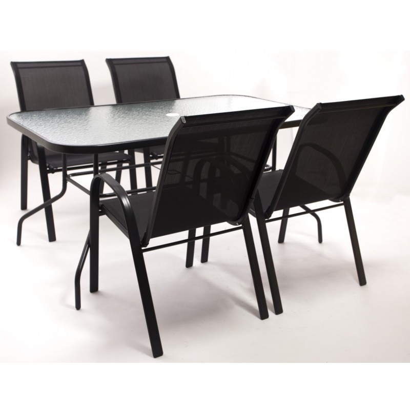 Die ELLA Gartenmöbel machen es Ihnen einfach, den Sommer so richtig zu genießen. Das schwarzfarbene Gestell und die schwarze Textilen-Bespannung bilden eine elegante Einheit und sind zudem sehr pflegeleicht. Das Sicherheitsglas, das innerhalb des Tischrahmens liegt, verleiht der Garnitur ihren edlen Charakter.Abmessungen: