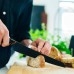 Groß, kraftvoll und dennoch schlank und zeitgemäß präsentiert sich das Brotmesser aus der Edge Serie von Fiskars. Die auffällige, 23 cm lange, schwarze Klinge aus japanischem, rostfreiem Stahl (Härte: 53 HRC), verfügt über einen Wellenschliff, der das Messer sauber durch harte Brotkrusten schneiden lässt ohne die Krume zu zerreißen. Scharf und stabil schneidet es Brot ohne großen Kraftaufwand, aber auch andere harte und feste Lebensmittel wie Obst und Gemüse. Dank der PTFE Beschichtung haftet das Schnittgut nicht an der Klinge. Darüber hinaus bewahrt die Beschichtung die Klinge in puristischer Linienführung vor Rost und vorzeitiger Abnutzung. Verschmutzungen lassen sich dank der Antihaftbeschichtungen einfach mit klarem Wasser abspülen. Ähnlich pflegeleicht wie die Schneide ist auch der sich nahtlos anfügende, ergonomisch geformte Griff aus schwarzem, rutschfestem Kunststoff.