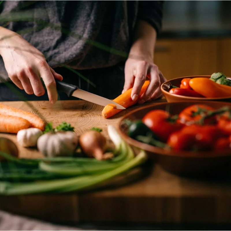 Die Fiskars Essential Messerserie ist auf Einfachheit, Funktionalität und Alltagstauglichkeit ausgelegt. Das Fiskars Essential Gemüsemesser ist ein mittelgroßes, handliches und vielseitiges Messer mit schlanker Klinge, ideal zum Schälen und Schneiden von Obst und Gemüse.