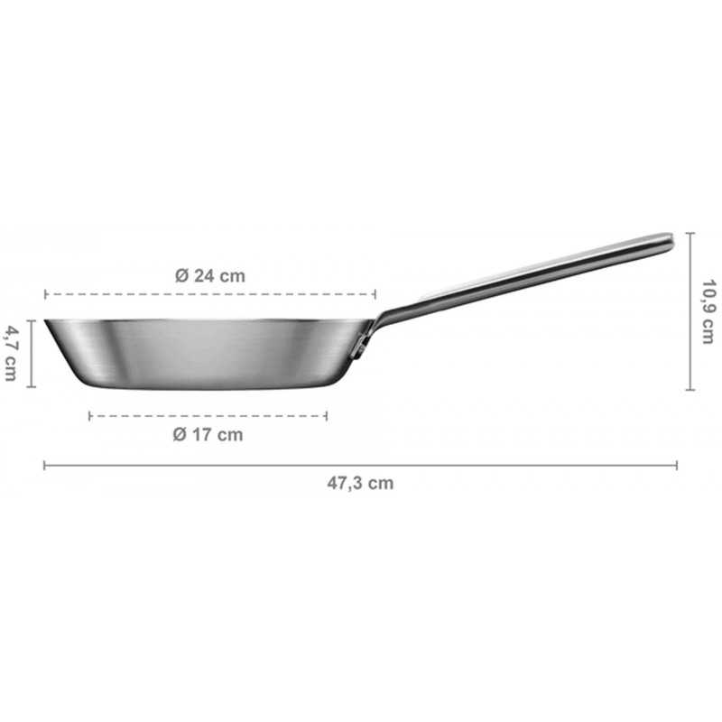 >- Mehrschichtige Konstruktion - die Pfanne hat einen 3,5 mm dicken Boden mit einem Aluminiumkern zwischen Schichten aus rostfreiem Stahl, der eine gleichmäßige Wärmeverteilung über die gesamte Oberfläche gewährleistet.