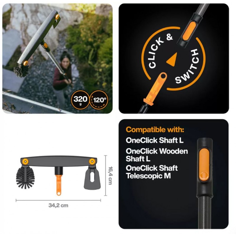 FISKARS Dachrinnenreiniger OneClick 1080698 ist ein praktisches und sicheres Werkzeug zur Reinigung von Dachrinnen vom Boden aus. Er kombiniert einen Schaber zum Entfernen grober Ablagerungen und eine abgerundete Bürste zur Endreinigung. Der verstellbare Kopfwinkel und die teleskopische FISKARS OneClick Stange ermöglichen ein schnelles, ergonomisches Arbeiten ohne Leiter.