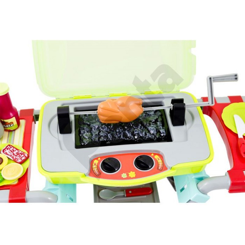 Kinder Barbecue set mit Zubehör.Kuststoff Spielzeugset Barbecue Gril auf den Rollen mit dem Deckel.