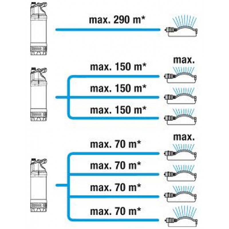 Möchtest Du mehrere Regner gleichzeitig betreiben? Die Tauch-Druckpumpe bietet Dir mit bis zu 5900 l/Stunde und 3,5 bar Leistungsdruck die Möglichkeit, bis zu drei große Regner zur selben Zeit zu benutzen. Die praktische Pumpe hat einen Durchmesser von 149 mm und lässt sich somit schon für Brunnen ab 150 mm Durchmesser verwenden. Die passenden Zubehörteile für genügend Freiraum sind direkt dabei: Das Ablassseil mit einer Länge von 20 m sowie das 15-m-Anschlusskabel bieten Dir genügend Freiraum bei der Installation.