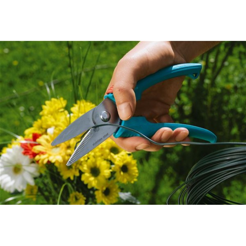 Gardena Classic Allzweckschere 8759-20Die Gardena Classic Garten-Allzweckschere 8759-20 ist universell einsetzbar. Egal ob zur Beerenernte, zum Schneiden von dünnen Zweigen, Schnur oder Draht: die Allzweckschere erfüllt ihren Zweck. Die Messer des geneigten Schneidkopfs sind aus rostfreiem Edelstahl. Das Untermesser hat einen speziellen Zahnschliff und einen integrierten Drahtabschneider. Dank der ergonomisch geformten Griffe mit zwei Griffpositionen liegt die Schere optimal in der Hand. Mit Hilfe des Einhand-Sicherheitsverschlusses kann die Schere einfach geschlossen und sicher aufbewahrt werden. Die Schere schneidet einen maximalen Astdurchmesser von 12 mm