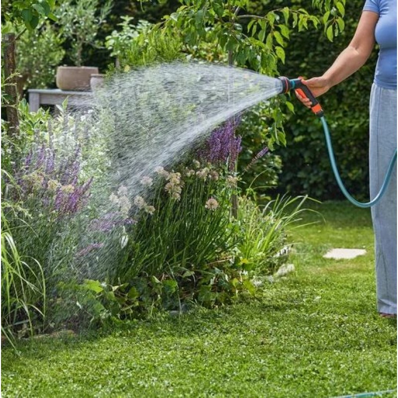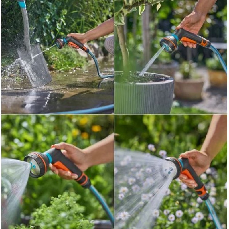 Zur Auswahl stehen Kegelstrahl für empfindliche Pflanzen, Stechstrahl für Reinigungsarbeiten, Brausestrahl für Topfpflanzen sowie Feinnebel für die gleichmäßige Bewässerung von Blumen- und Gemüsebeeten. Der Wechsel zwischen den Sprühbildern erfolgt einfach und schnell.