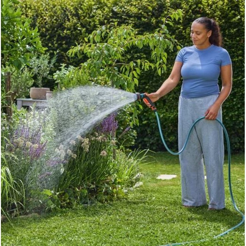 Das Classic Multifunktionsbrause Starter Set von GARDENA bietet vier vielseitige Sprühbilder für unterschiedliche Bewässerungs- und Reinigungsaufgaben. Der feine Sprühnebel eignet sich ideal für empfindliche Pflanzen, der harte Strahl für Reinigungsarbeiten, der Vollstrahl für Topfpflanzen und das sanfte Sprühbild für eine gründliche Bewässerung von Blumen- und Gemüsebeeten.