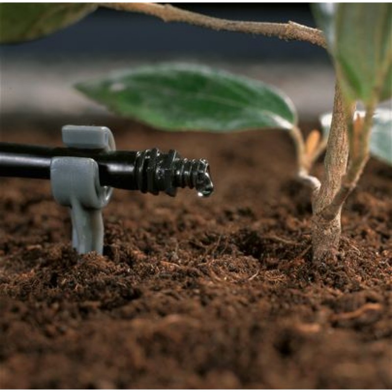 Dieser Endtropfer eignet sich – im Rahmen des Micro-Drip-Systems – für die punktuelle Bewässerung von Einzelpflanzen oder längeren Pflanzenreihen mit ähnlichem Wasserbedarf, wie z.B. Hecken. Die Wasserausbringmenge beträgt ca. 4 Liter pro Stunde. Für die Bewässerung einzeln stehender Pflanzen wird der Endtropfer am Ende des 4,6 mm (3/16“)-Verteilerrohrs eingedreht. Mit dem Montagewerkzeug (Art.-Nr. 8322-20) kann das 13 mm (1/2“)-Verlegerohr gelocht und die Endtropfer direkt montiert werden. Im Lieferumfang sind 25 Tropfer und eine Reinigungsnadel enthalten. Die Reinigungsnadel dient zum einfachen Säubern der Tropfer von Verschmutzungen.illustration foto