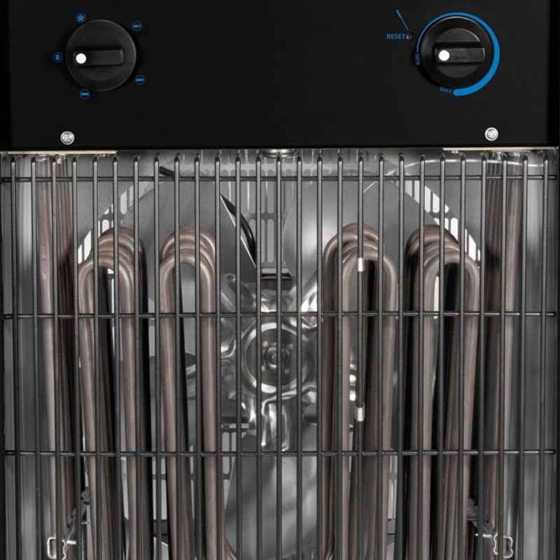 Das Heizgerät arbeitet mit Drehstrom 400 V, erreicht einen Luftdurchsatz von 1292 m3/h und ist mit einem Raumthermostat ausgestattet, das eine automatische Temperaturregelung gewährleistet. Die Stahlkonstruktion mit Schutzgitter und Schutzart IPX4 sorgt für einen sicheren und zuverlässigen Betrieb auch unter anspruchsvolleren Bedingungen.